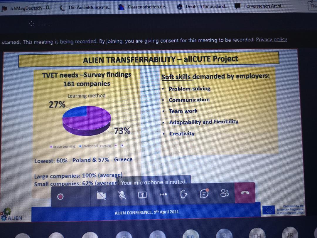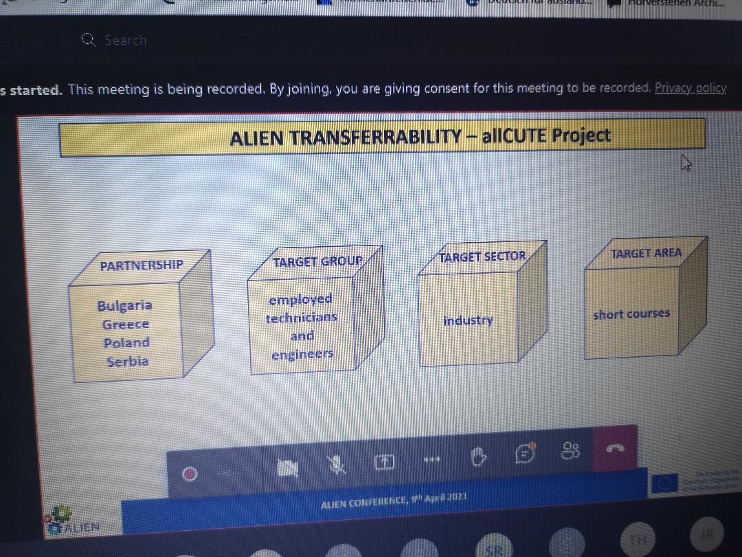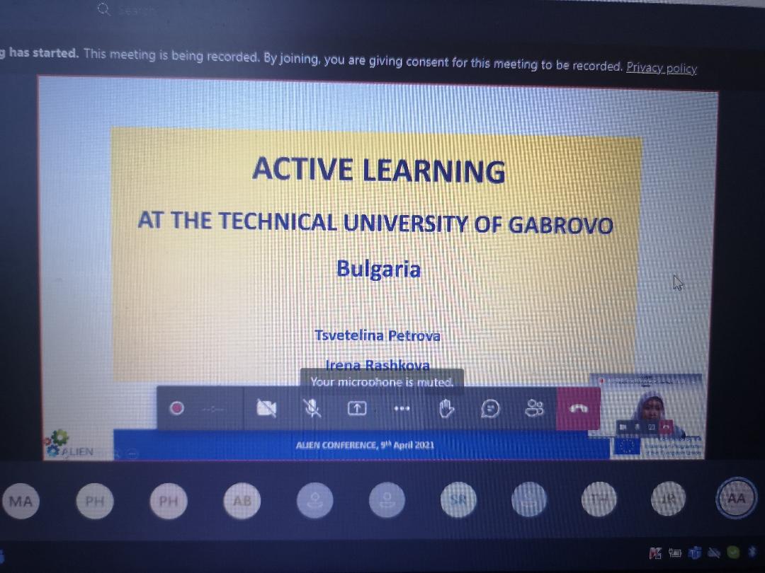 On 9th April 2021 Irena Rashkova (Project Coordinator) participated in a conference organized within the ALIEN project. The conference was attended by about 40 university teachers and VET providers from European and Asian countries. She delivered a PPP on Active Learning Practices at the Technical University of Gabrovo, where she focused on allCUTE project as a best practice and the findings of the Survey related to the TVET needs of technicians and engineers employed in the sector of Machine Building and Mechatronics.